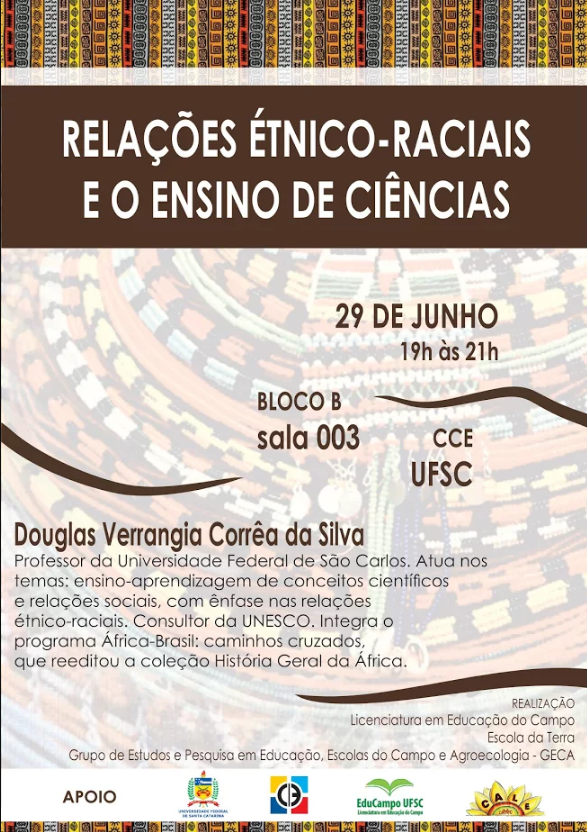 Ocorrerá no dia 29 de junho, às 19h a palestra “Relações étnico-raciais e o ensino de ciências”, na sala 003, bloco B do Centro de Comunicação e Expressão (CCE) da UFSC.